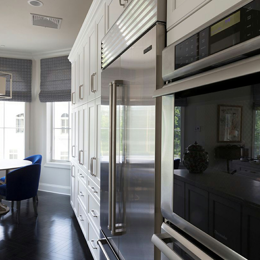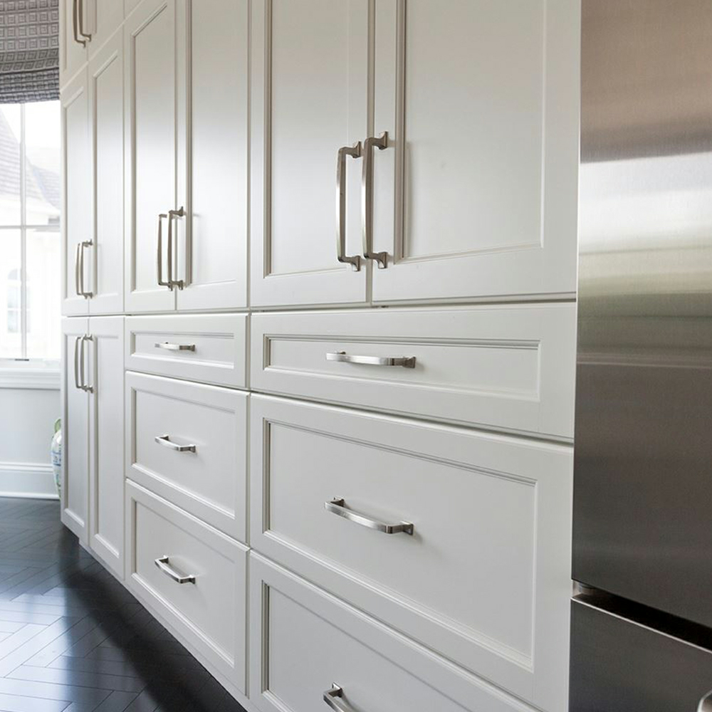 The Amerock Rochdale 12in(305mm) center-to-center appliance pull is finished in Satin Nickel. Fusion of architectural details and runway flair create a utilitarian elegance in the Rochdale Collection. Rivets and masculine design aesthetics give it an industrial look.