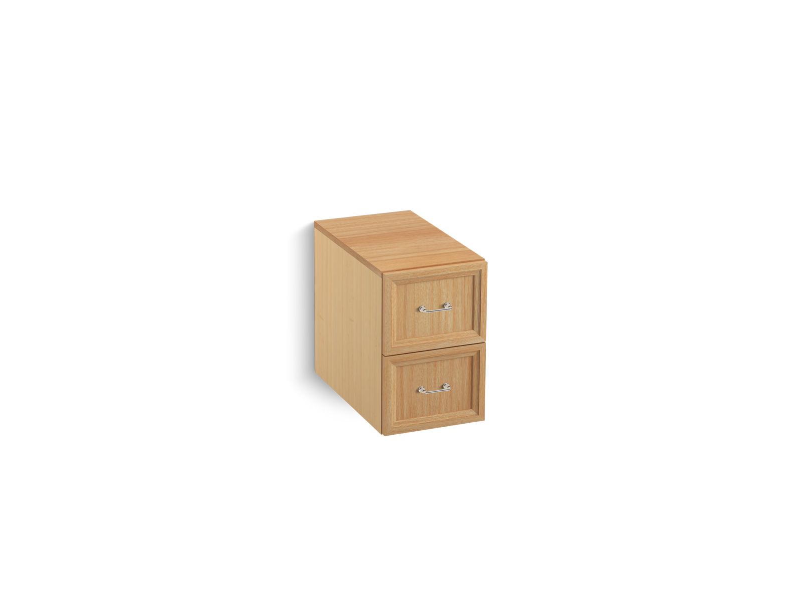 This two-drawer bridge provides additional storage and counter space for your Damask vanity, creating the perfect spot to sit down while grooming and applying makeup. Place it between two vanities or between the vanity and a wall. The two tall drawers offer generous storage.
