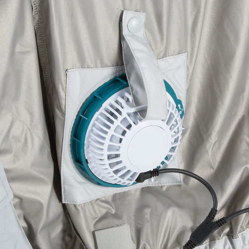 In addition to powering the expanding line-up of 18V cordless tools and accessories, Makita 18V batteries can help you keep cooler in hot job site conditions. The 18V LXT Cordless Reflective Fan Jacket has a power source that accepts Makita 18V LXT and 18V Compact Lithium-Ion batteries (sold separately) that power two recessed fan units located on the left and right sides of the jacket. The fan units provide air circulation inside the jacket for up to 15 hours of run time on the high setting when using a 5.0Ah battery (BL1850). It also features two ice pack storage compartments on the back of the jacket for increased cooling. You can also keep your portable electronic devices charged-up with the convenient on-board USB power port.The Fan Jacket has three air flow modes plus turbo mode so you can adjust the air flow to the work conditions. It features Titanium-coated polyester to reflect ultraviolet and infrared rays, and double-layered shoulder area for added comfort and durability. The knitted cuffs and waist to provide a better fit, which helps keep the air circulating inside the jacket. It has 5 pockets including two zippered chest pockets with a hole that enables mobile devices to be stored and charged while wearing the jacket (USB charging cable is optional). The battery slides onto the power source, which features an integrated belt clip so it's out of your way but within reach for quick and easy access. It is an ideal solution for working in hot weather conditions, or in close quarters including attic spaces.It’s part of Makita’s expanding 18V Lithium-Ion system, the world’s largest cordless tool system powered by 18V Lithium-Ion slide-style batteries. Makita 18V Lithium-Ion batteries have the fastest charge times in their categories, so they spend more time working and less time sitting on the charger.