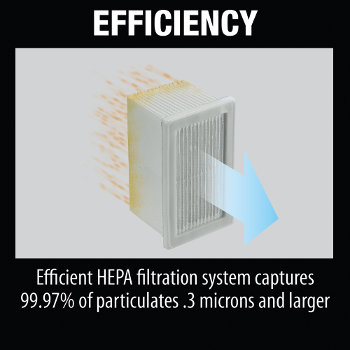 - Efficiency: Efficient HEPA filtration system captures 99.97% of particulates .3 microns and larger