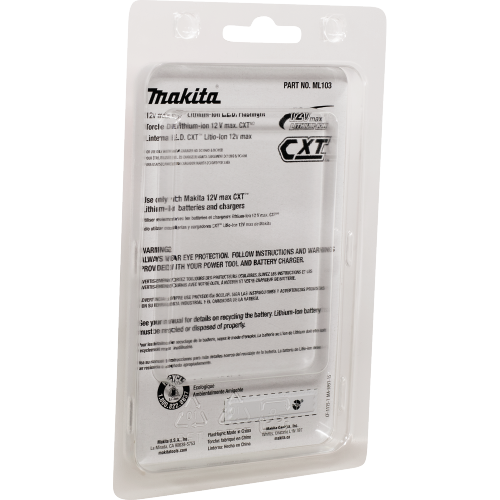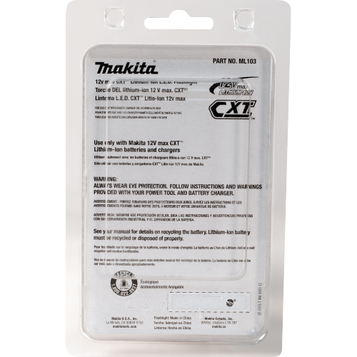 The Makita 12V max CXT Lithium-Ion Cordless L.E.D. Flashlight (ML103) is a portable and ultra-compact light source. It is compatible with Makita 12V max CXT Lithium-Ion slide-style 2.0Ah and 4.0Ah batteries (sold separately). The efficient L.E.D. light delivers long run time, with up to 28 hours per charge using the 4.0Ah battery.The ML103 is 3-7/16” long and weighs only 0.6 lbs. (with 12V max CXT 2.0Ah battery, sold separately). The compact size makes it ideal for convenient illumination in tight spaces.For longer run time, all 12V max CXT cordless tools are also compatible with the 12V max CXT Lithium-Ion 4.0Ah battery (BL1041B, sold separately). 12V max CXT lithium-Ion batteries are engineered with a Battery Protection Circuit that protects against overloading, over-discharging and over-heating. It’s part of the expanding 12V max CXT series, combining performance with superior ergonomics in a compact size.