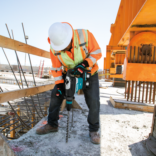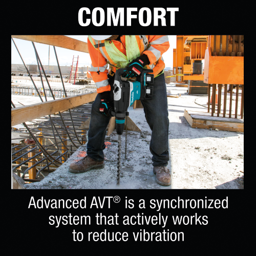 The Makita 36V (18V X2) LXT Brushless 1-9/16” Advanced AVT Rotary Hammer with AWS is a cordless concrete solution that’s loaded with advanced engineering for maximum efficiency. It’s equipped with Auto-Start Wireless System (AWS) for wireless connectivity with an AWS-equipped dust extractor (sold separately), and features Advanced AVT for reduced vibration. It also features Active Feedback-Sensing Technology (AFT), which electronically turns off the motor if rotation of bit is suddenly forced to stop. It’s powered by two 18V LXT batteries and an efficient brushless motor for maximum power, speed and run-time for corded demands, without the cord.The XRH07PTUN is engineered with Advanced Anti-Vibration Technology (AVT), a synchronized three-component system for significantly less vibration. AVT is more than just a padded handle. The three-component system includes an internal counterbalance that uses air pressure to move counterweight pistons in the opposite direction of the drive piston to actively reduce vibration. The result is a low vibration rating of only 5m/s², but with no compromise in performance: The efficient brushless motor delivers a full 8.4 ft. lbs. of impact energy, with 250-500 RPM and 1,450-2,900 BPM.For improved efficiency, it’s equipped with Auto-Start Wireless System technology. AWS utilizes Bluetooth technology for wireless communication between the tool and dust extractor (sold separately). When the trigger of the AWS-equipped XRH07PTU is engaged, the AWS-equipped dust extractor powers-up. When the trigger is released, the dust extractor powers-down. AWS is intelligent communication that eliminates cords and excessive noise since the dust extractor runs only when the tool is running.Additional performance features include Active Feedback-Sensing Technology (AFT), which electronically turns off the motor if rotation of bit is suddenly forced to stop, and constant speed control that automatically adds power to the motor to maintain speed under load to complete the most demanding jobs. Soft start technology suppresses start-up reaction for more precision and better accuracy, and the soft no-load function automatically reduces the speed of the motor when idling – this helps increase tool life and battery run-time.The XRH07PTUN is engineered for a range of concrete applications including drilling/coring through-holes for pipes, setting larger anchors, securing tilt-wall supports, small chipping applications, and more. It is ideal for a range of trades including masons, concrete contractors, demolition contractors, plumbers, electricians, sprinkler installers, and general contractors seeking a best-in-class rotary hammer. It accepts SDS-MAX bits.It’s part of Makita’s expanding 18V Lithium-Ion system, the world’s largest cordless tool system powered by 18V Lithium-Ion slide-style batteries. Makita 18V Lithium-Ion batteries have the fastest charge times in their categories, so they spend more time working and less time sitting on the charger.For improved tool performance and extended battery life, Makita created Star Protection Computer Controls. Star Protection is communication technology that allows the Star Protection-equipped tool and battery to exchange data in real time and monitor conditions during use to protect against overloading, over-discharging and overheating. For increased versatility, the tool can also be powered by Makita 18V LXT and Compact Lithium-Ion batteries with the star symbol on the battery indicating Star Protection inside.