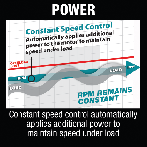- Power: Constant speed control automatically applies additional power to maintain speed under load